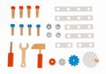 Drevené chodítko a zároveň vozík s náradím obsahuje: magnetické náradie - kladivo, skrutkovač a kľúč, 1 zverák, 4 ozubené kolieska, 4 klince, 4 skrutky, 4 matky, 2 dosky s 2 otvormi, 2 dosky s 3 otvormi, 2 dosky s 4 otvormi.